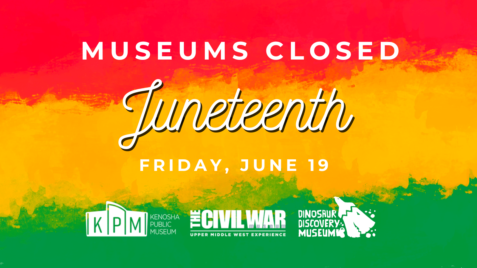 The Kenosha Public Museum, Civil War Museum, and Dinosaur Discovery Museum will be closed Friday, June 19th in observance of the Juneteenth holiay.